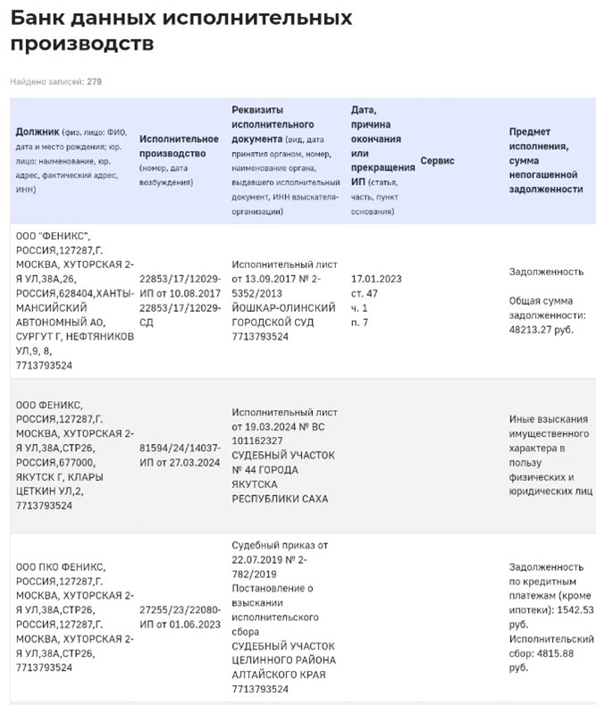 Что любопытно, против самого «Феникса» в качестве должника сегодня числится 279 исполнительных производств в ФССП: